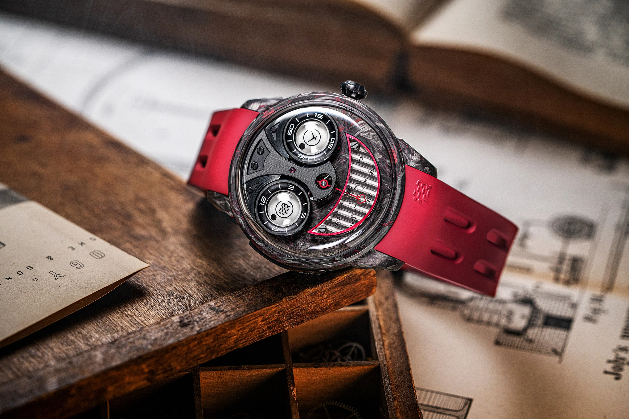 Корпус Из текстурного серо-чёрного углеволоконного композита с красными вкраплениями; задняя крышка с сапфировым окном; заводная головка из чернёной нержавеющей стали