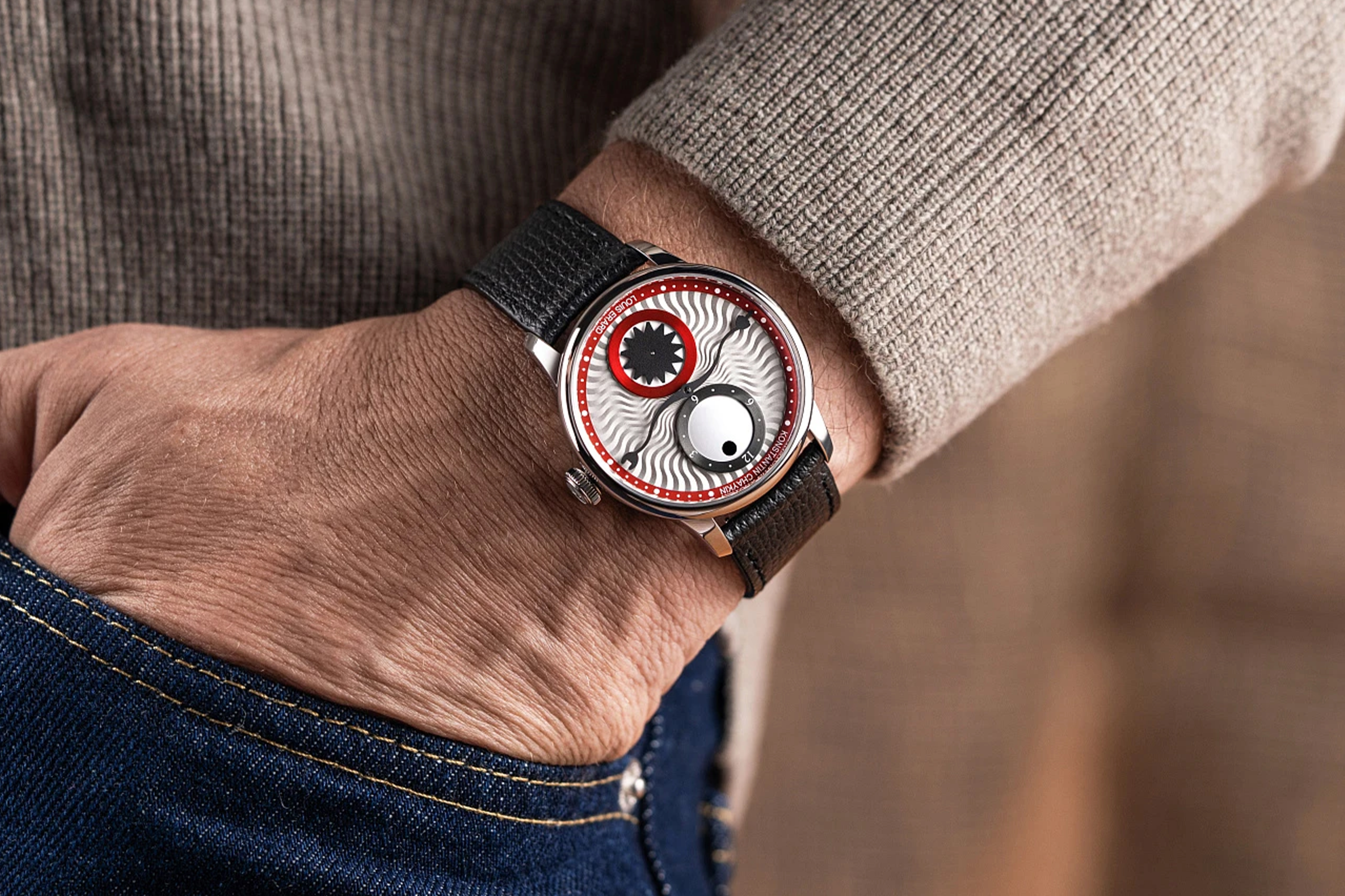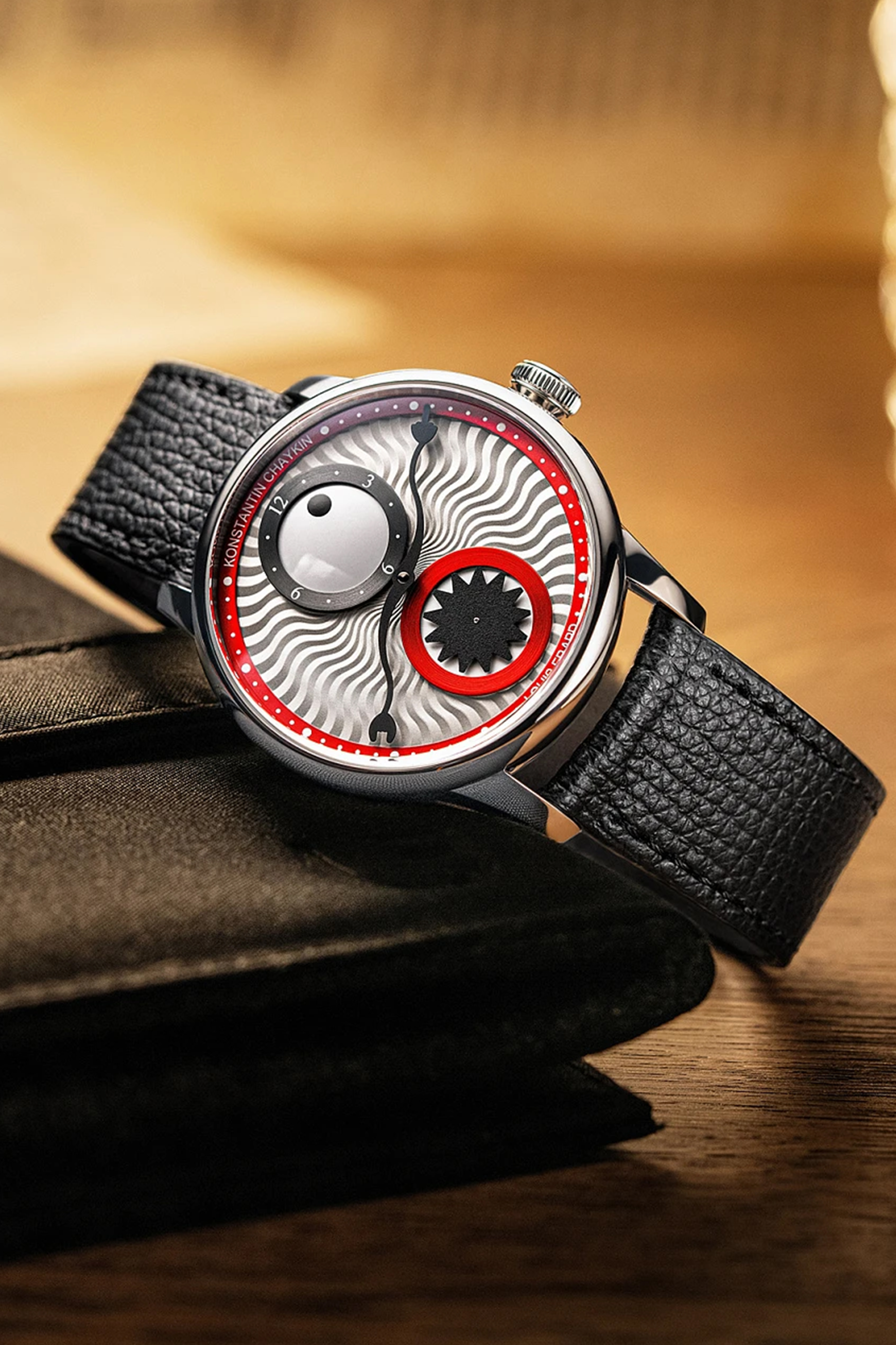 | Циферблат | Волнистый рельефный декор, глянцевое красное кольцо часов и минут с белыми печатными логотипами (Louis Erard на отметке «6 часов», Konstantin Chaykin на отметке «12 часов»). Глянцевый белый диск часовой индикации в виде глаза, матовый чёрный диск секунд в форме звезды, матовая чёрная минутная стрелка с двумя наконечниками в виде лап монстра |