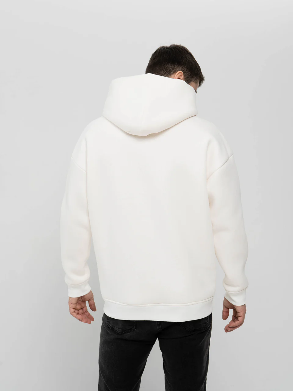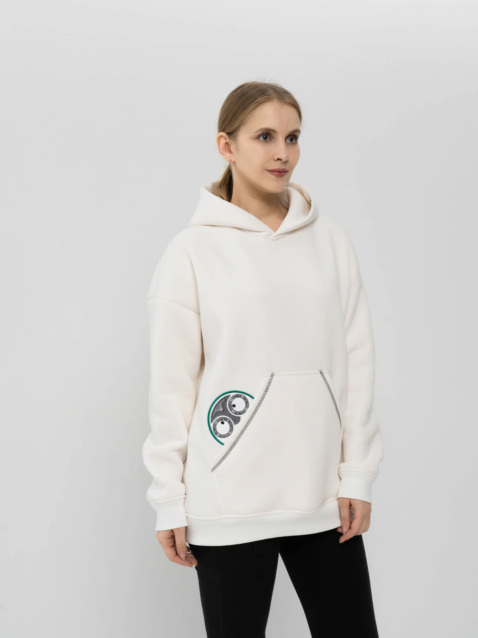 Это уютное белое худи выполнено из качественного материала френч терри с мягкой подкладкой, что гарантирует идеальную посадку и сохранение тепла в прохладную погоду. Светлый базовый оттенок служит великолепным фоном для выразительных декоративных элементов, а классический свободный крой делает изделие абсолютно универсальным для любого современного повседневного образа.