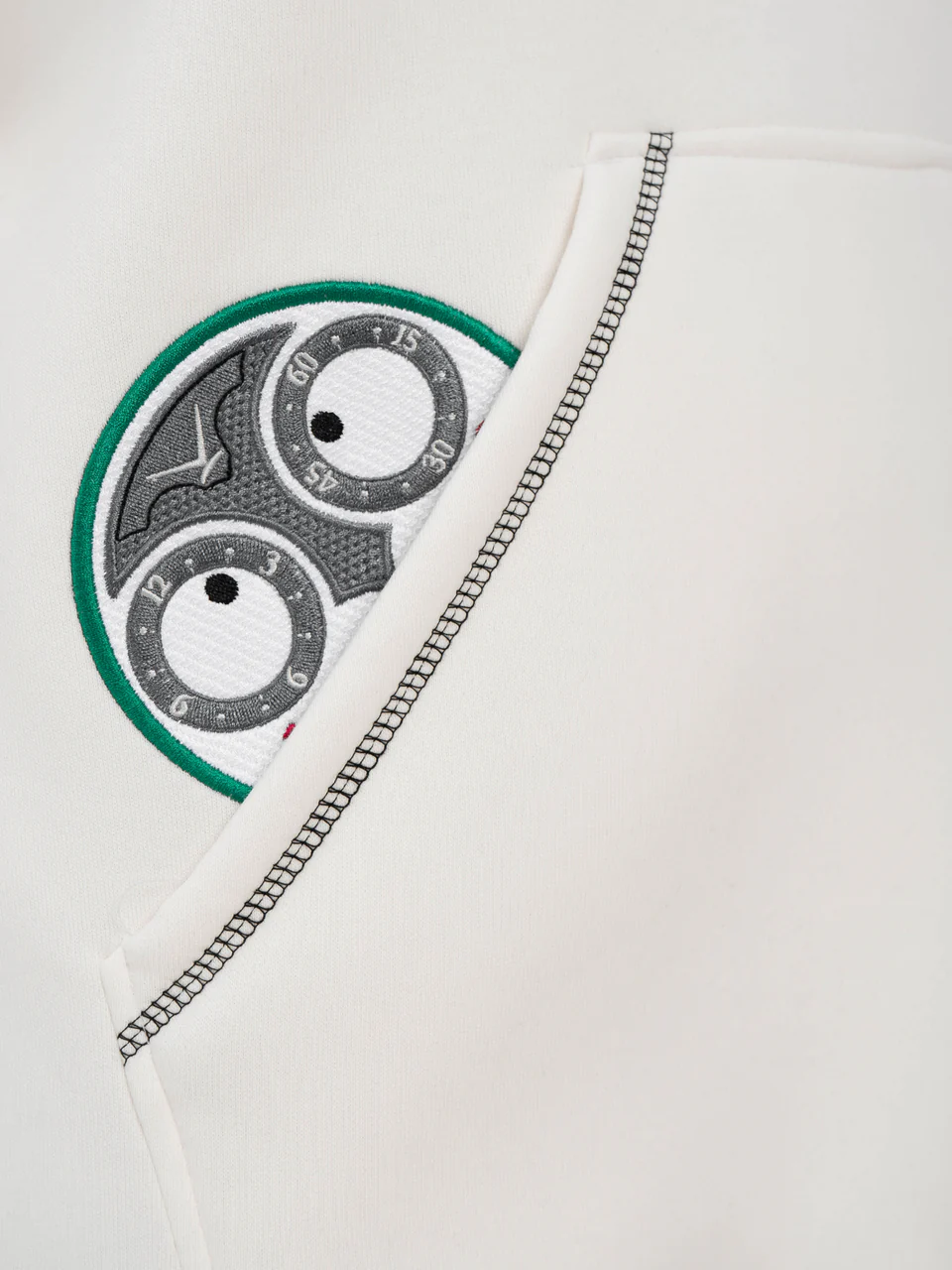 Премиальное белое худи из мягкого френч терри объединяет в себе бескомпромиссный комфорт и сложную детализацию, скрывая вышитый циферблат знаменитых часов прямо внутри кармана-кенгуру.