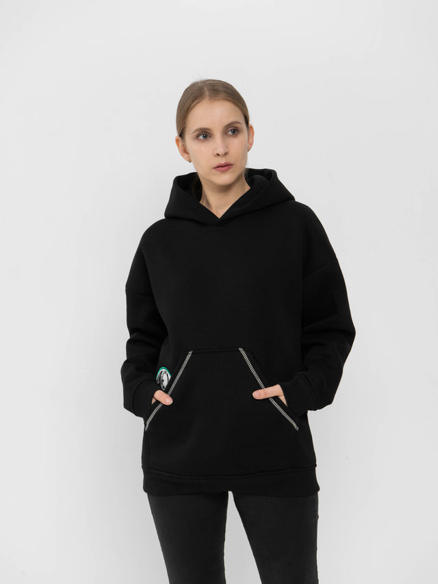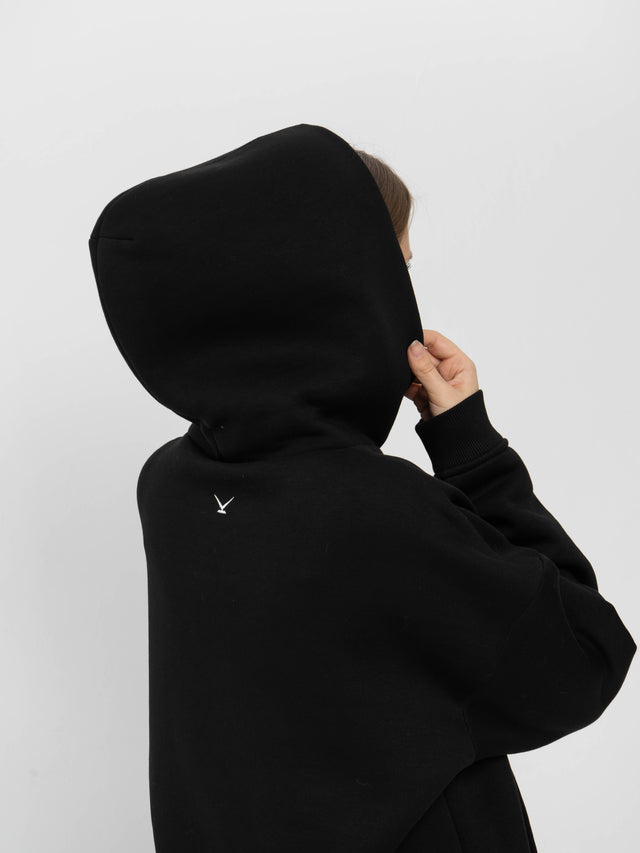Удобное черное худи выполнено из качественного материала френч терри с мягкой подкладкой, обеспечивая высокий уровень комфорта и сохранение тепла в прохладную погоду. Продуманный свободный крой и универсальный темный оттенок делают это изделие идеальным базовым элементом повседневного гардероба, который легко сочетать с любым стилем.