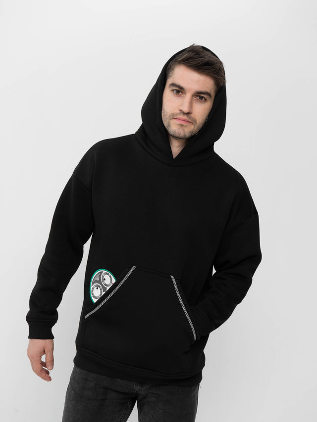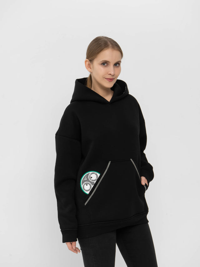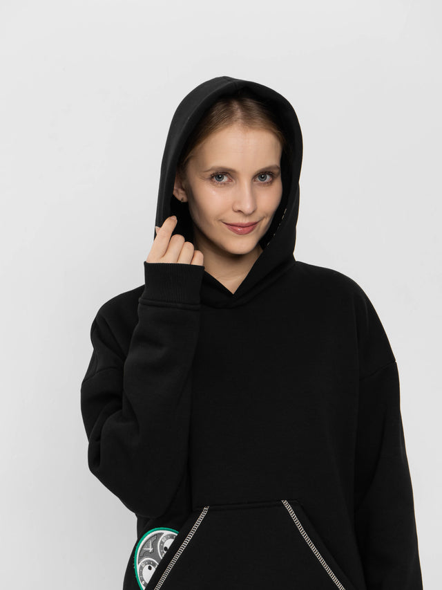 Черное худи из плотного материала френч терри привлекает внимание контрастной строчкой и оригинальной концепцией: детальная вышивка культового циферблата интригующе спрятана внутри просторного кармана-кенгуру.