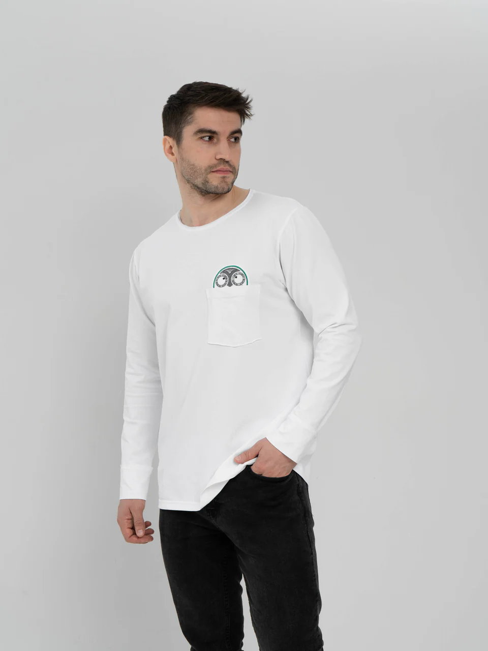 Лаконичный белый лонгслив базового кроя скрывает в себе очаровательную дизайнерскую пасхалку: внутри нагрудного кармашка тайно вышита знаменитая улыбка культовых часов «Джокер».