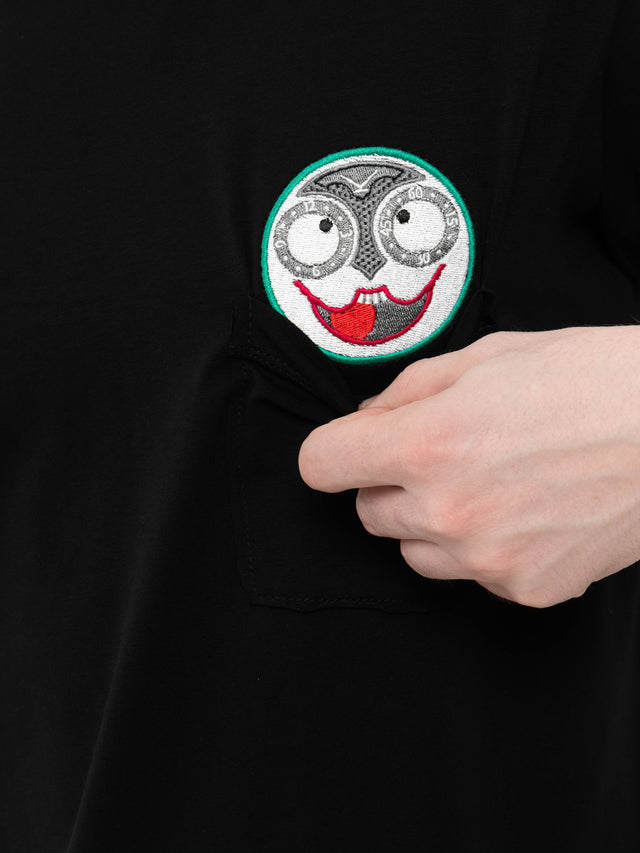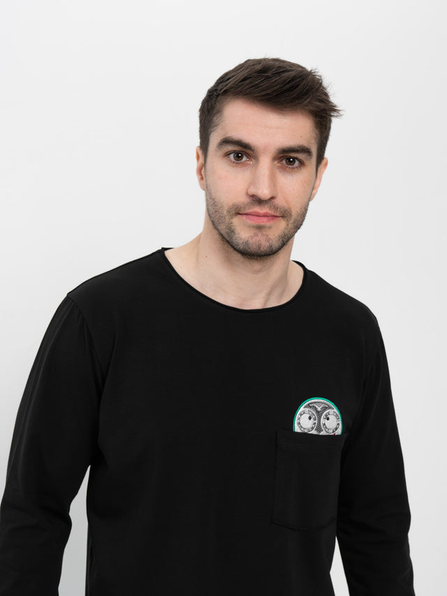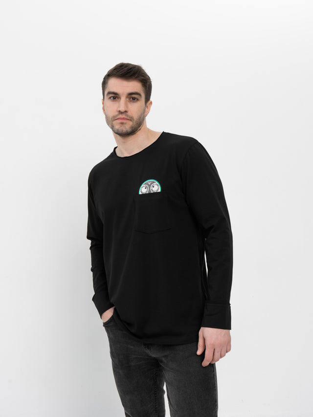 Стильный черный лонгслив классического силуэта, интригующий своей лаконичностью и секретной деталью — искусно вышитым циферблатом легендарных часов «Джокер», который деликатно прячется внутри нагрудного кармана.