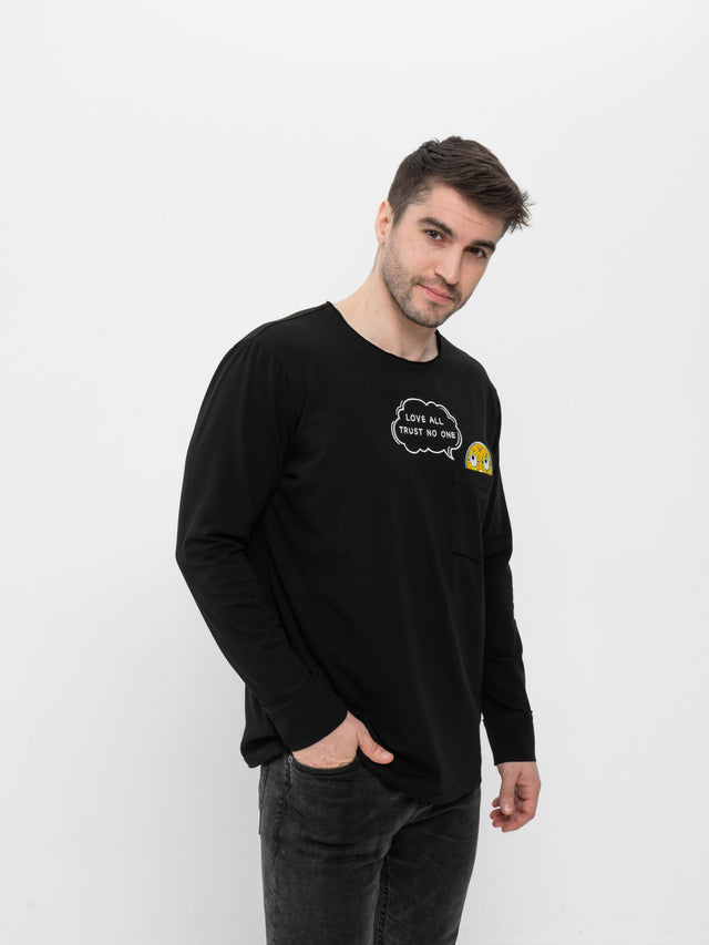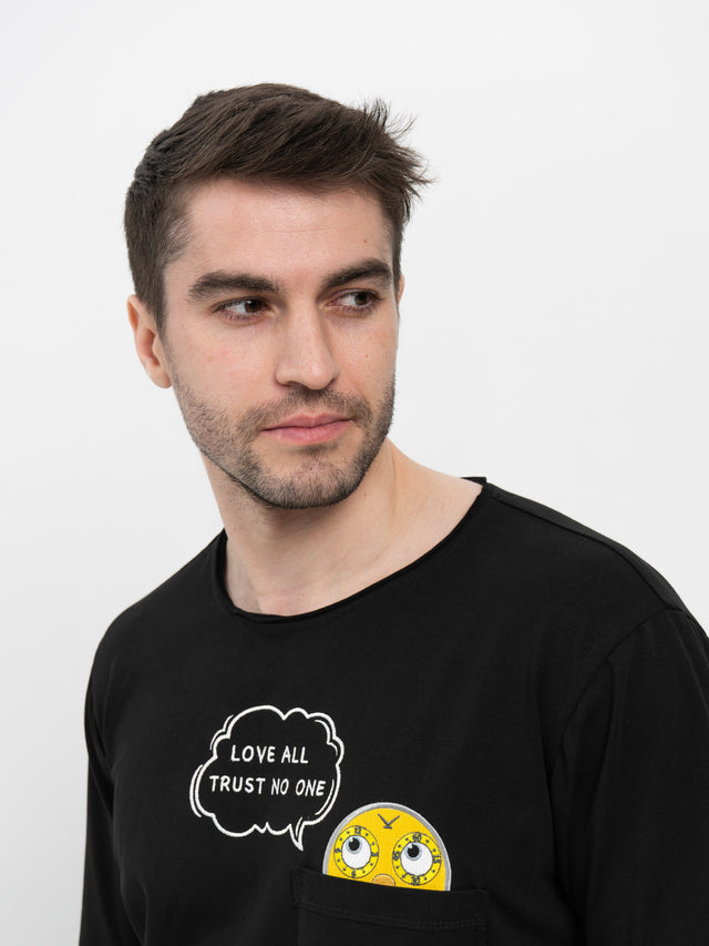 Универсальный темный лонгслив, строгий минимализм которого искусно разбавлен оригинальной вышивкой в виде текстового облака и спрятанным в нагрудном кармане сказочным циферблатом.