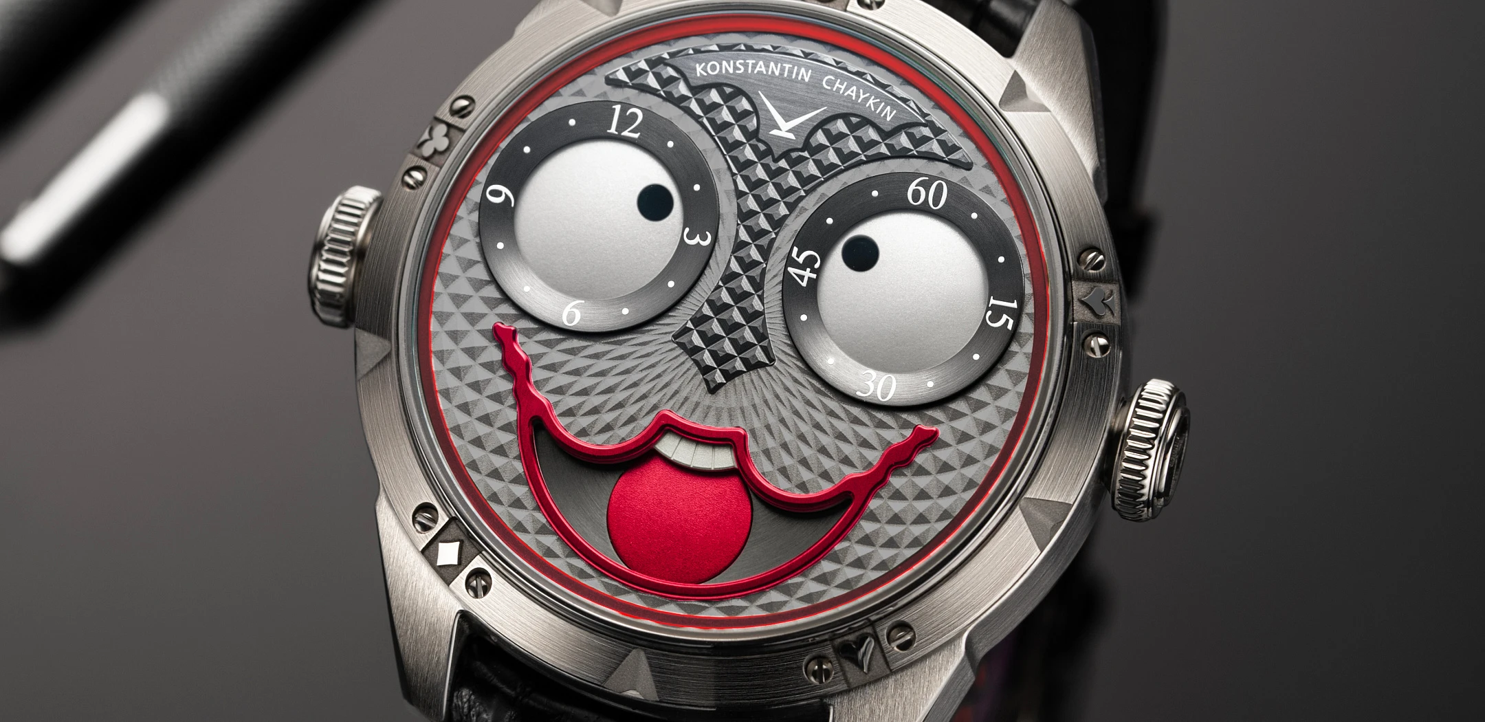 Диаметр стального корпуса был уменьшен до более удобных сорока миллиметров, а безель стал более тонким. В качестве напоминания об истоках коллекции на нем выгравированы символы карточных мастей и характерная буква. На циферблате меньшего размера сохраненные дисковые указатели часов и минут выглядят крупнее, поэтому персонаж кажется еще более глазастым.