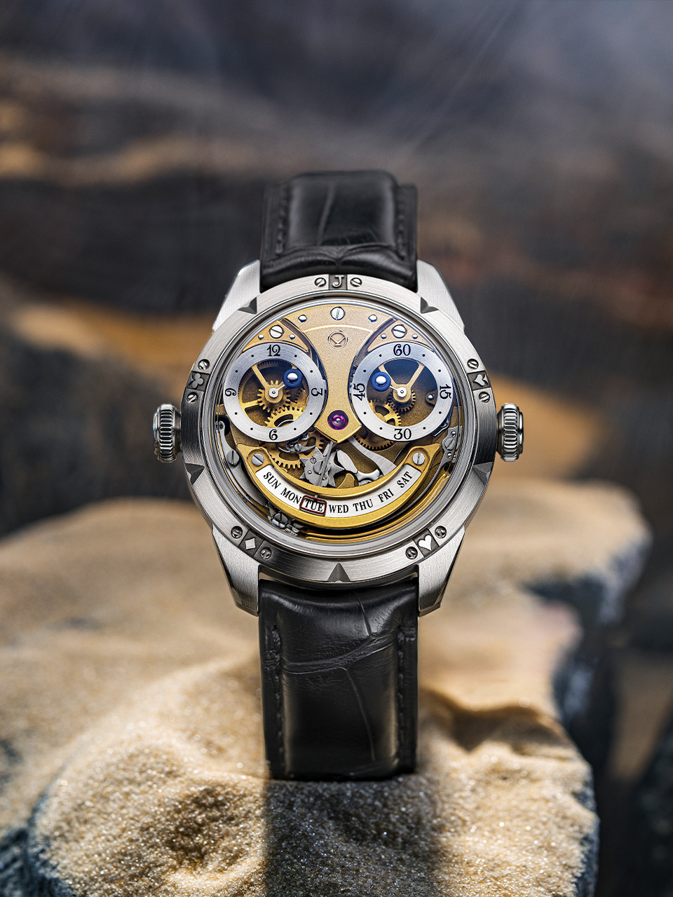 Всего три элемента функционально относятся к циферблату — это глаза маски, служащие шкалами часов и минут, и размеченный шкалой дней недели улыбающийся рот. Картину дополняют часовая и минутная стрелки с декоративными кольцами из воронёной стали, а также стрелка секторного индикатора с красным прямоугольным наконечником.