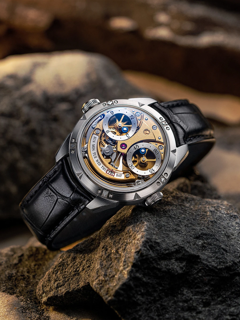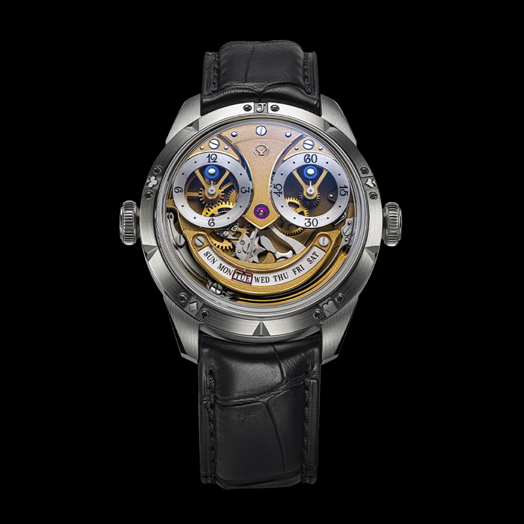 Авангардный ристмон с открытым циферблатом привлекает внимание декорированными в изморозном стиле деталями с позолотой, которые дарят уникальное золотистое сияние и искусно маскируют сложную механику.