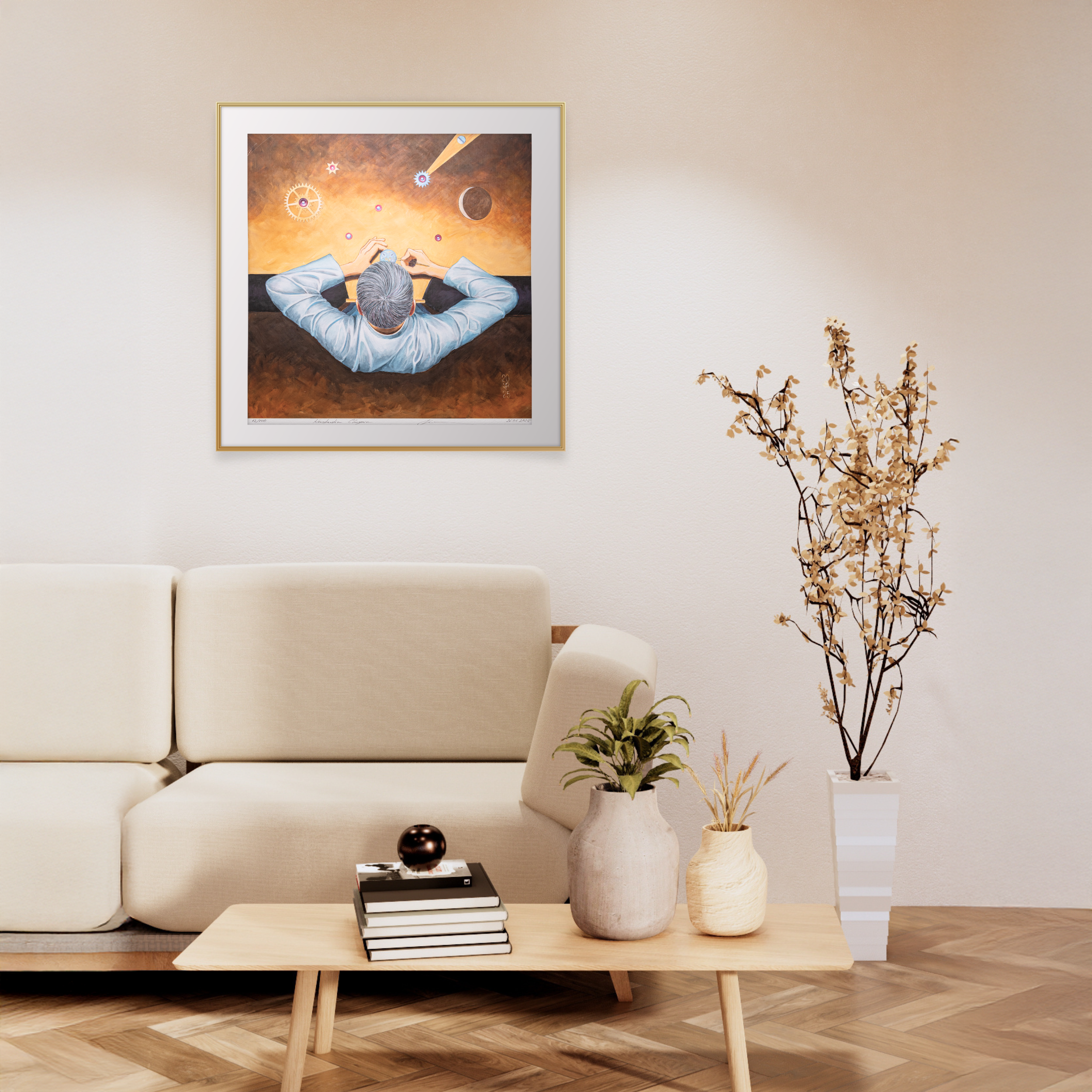 Жикле выполнен методом высокоточной цифровой печати с безупречной цветопередачей на немецкой архивной бумаге плотностью 350 г/м². Лимитированный и нумерованный тираж гарантирует коллекционную ценность и долговечность произведения. Пусть эта работа долгие годы вдохновляет Вас, напоминая о таинстве рождения времени и о том, как одна смелая мысль может соединить вселенную с крохотным колесиком часов.