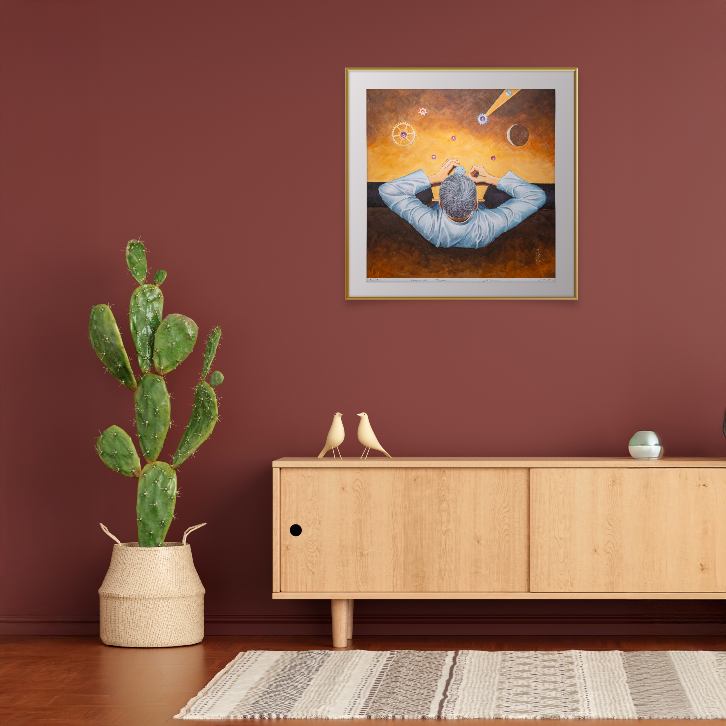 На полотне мастер запечатлел себя в момент работы над ультратонким механизмом ThinKing. Разложенные на верстаке детали воспринимаются как небесные тела: шестерёнки отсылают к Солнцу и Луне, а часовой мост с миниатюрной шестерёнкой напоминает стремительную комету. Таким образом, микро-мир часового механизма перетекает в макро-космос, подчёркивая идею Уильяма Пейли о том, что сложный механизм свидетельствует о наличии выдающегося творца. Сам Чайкин выступает здесь в роли демиурга, соединяя инженерную точность и творческое вдохновение.