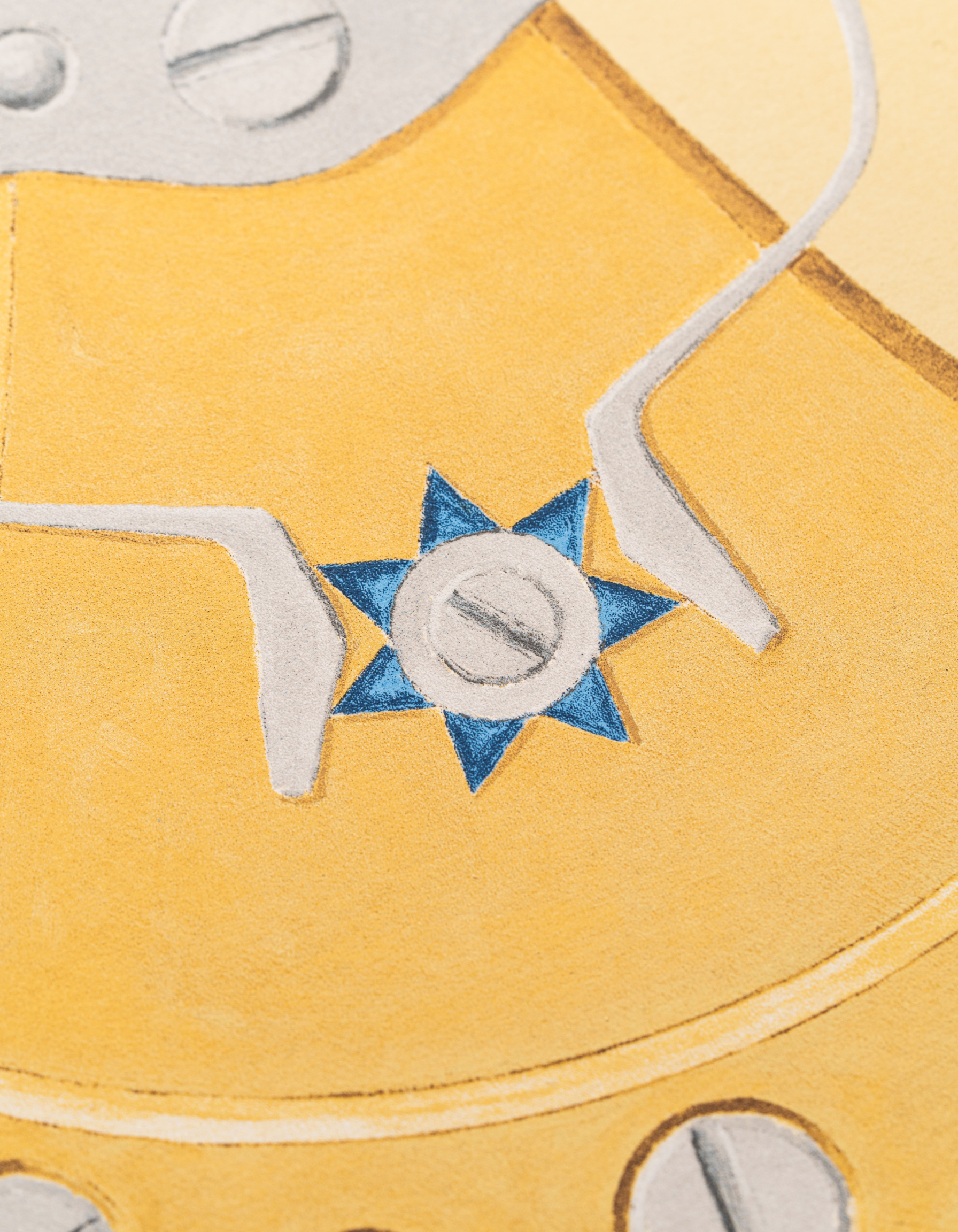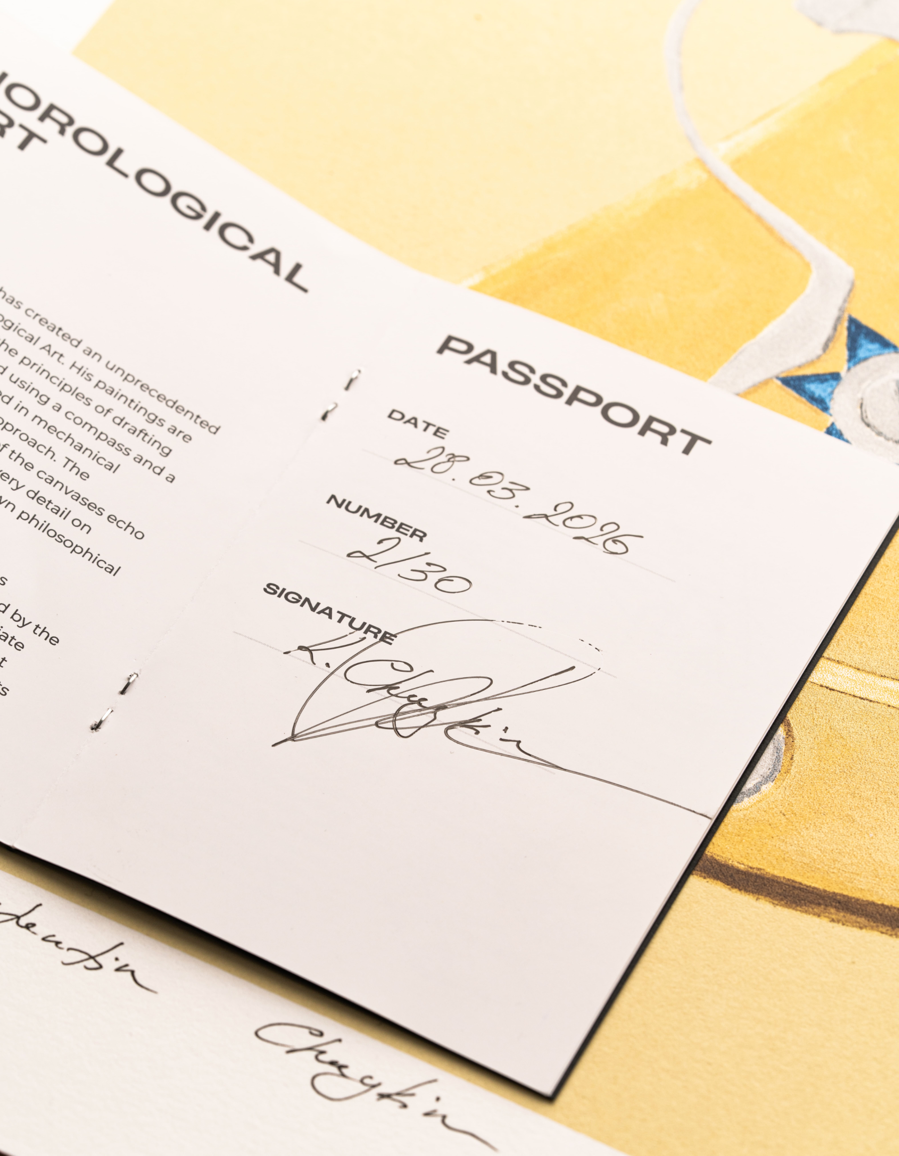 Чтобы передать глубину палитры масштабного полотна, для этого принта выбран особый способ исполнения – 14-цветная шелкография. При таком методе изображение наносится в несколько этапов, исключительно вручную. Под каждый цвет создается отдельный трафарет. Это роднит шелкографию с часовым искусством, где точность каждого движения имеет решающее значение. Шелкография выполнена на немецкой бумаге из 100% хлопка плотностью 300 г/м². Ограниченное число сюжетов в рамках цикла делает эту работу особенно ценной с точки зрения коллекционной значимости.