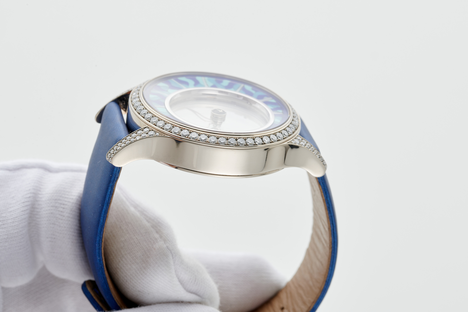 Часы гармонично дополнены изысканным ремешком из гладкого сатина, обеспечивающим комфорт при ношении. Надежная классическая пряжка также изготовлена из белого золота, завершая цельный и роскошный образ.