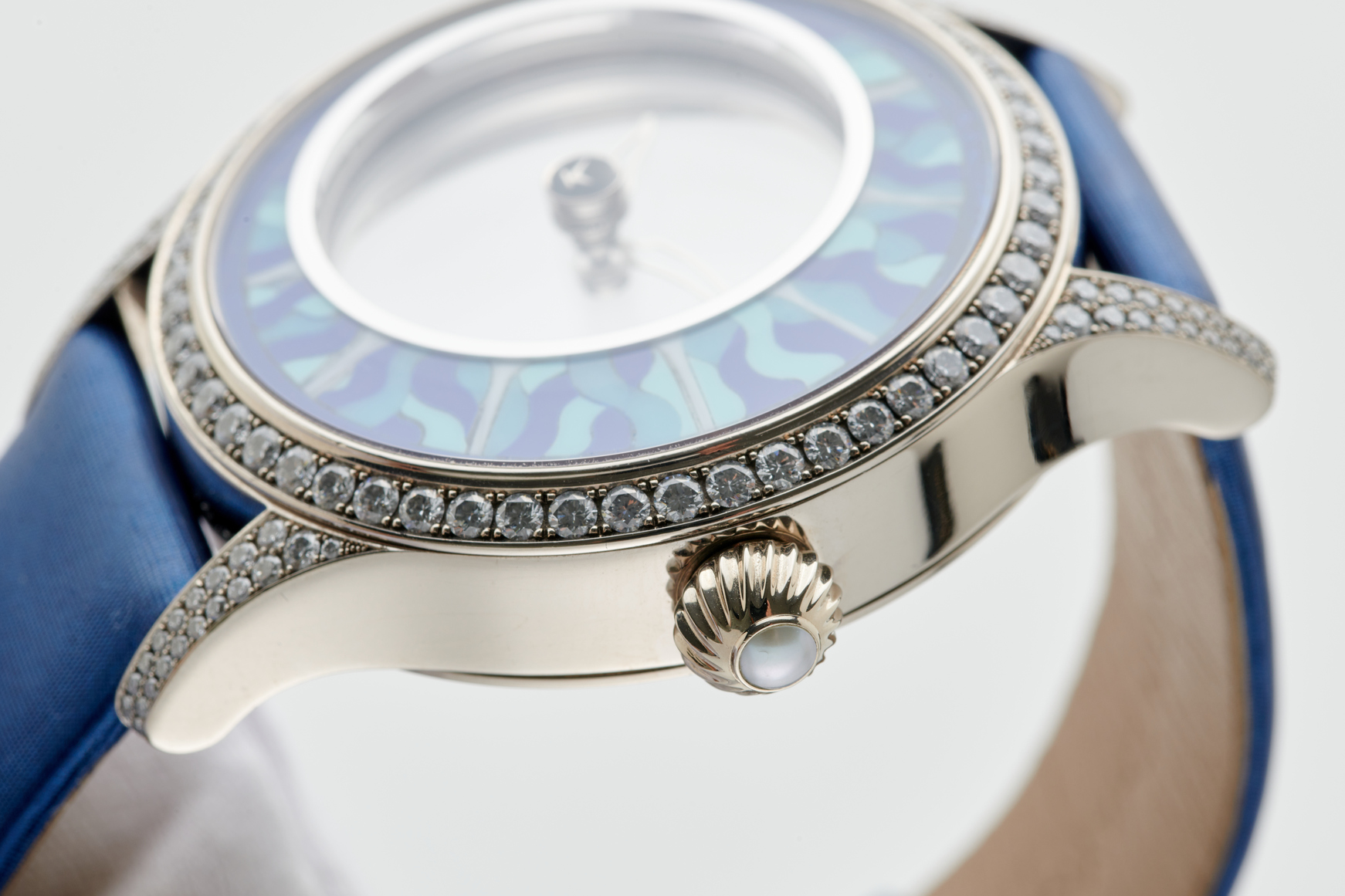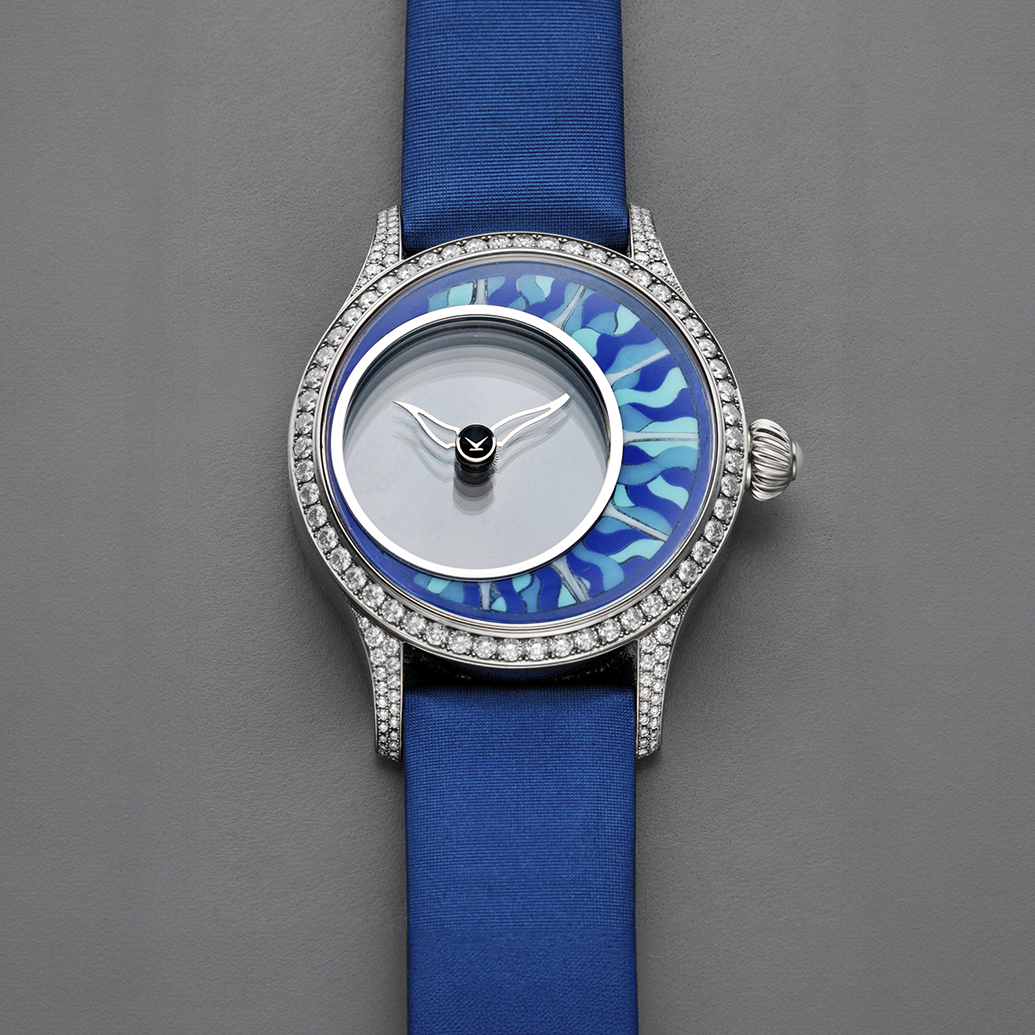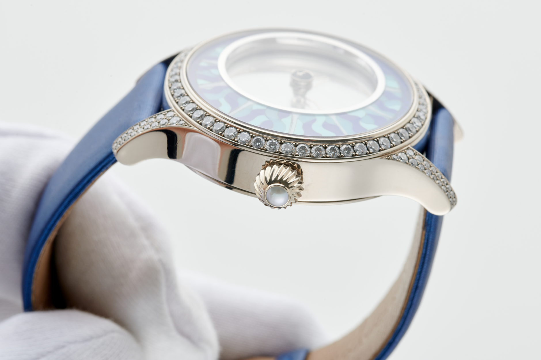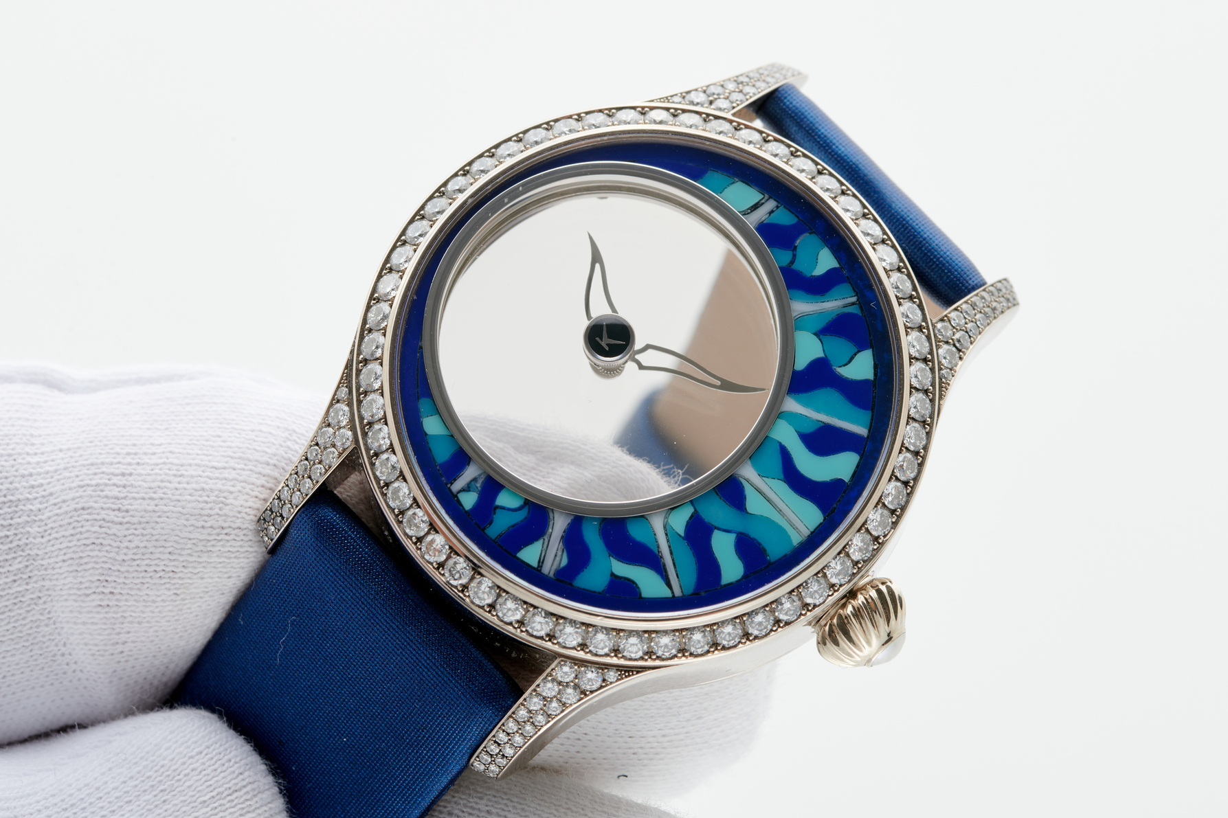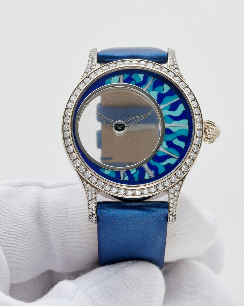 Эксклюзивные женские часы из белого золота, впечатляющие мистическим прозрачным циферблатом с оптической иллюзией «парящих» стрелок и элегантным сатиновым ремешком.