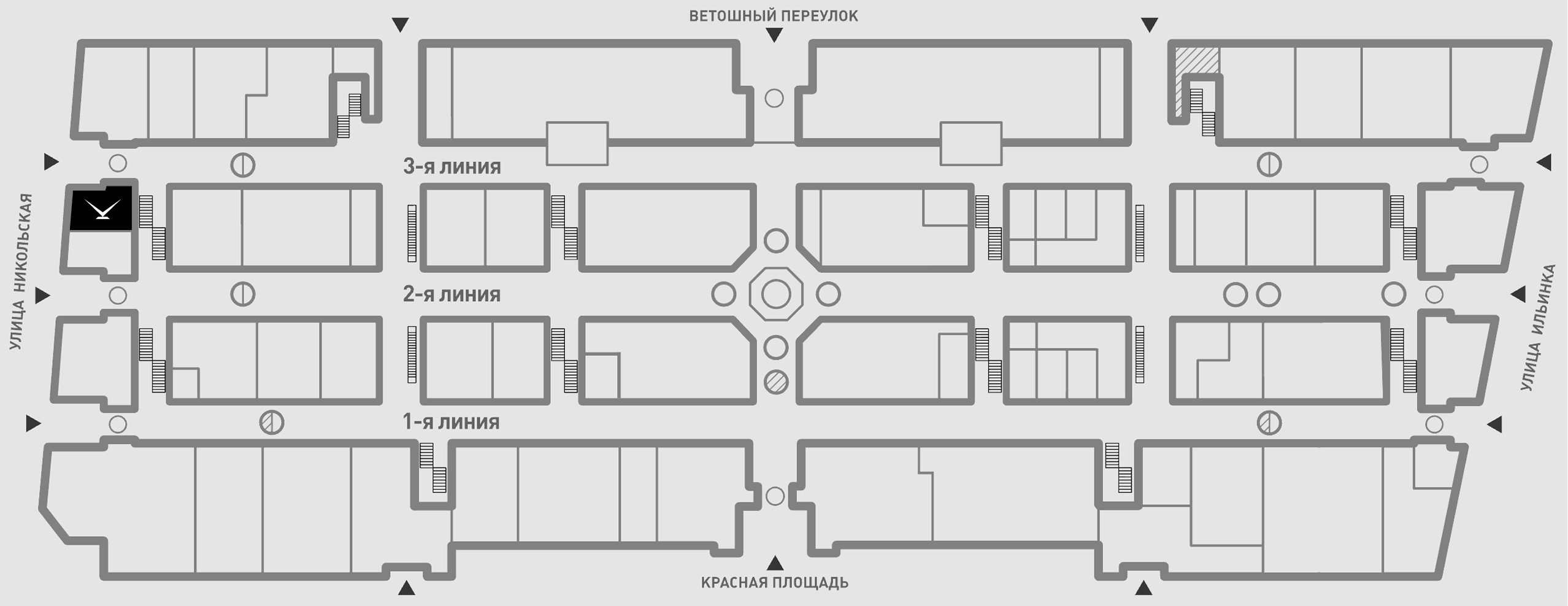 Архитектура ГУМа состоит из трех параллельных галерей (линий). 3-я линия — это та, которая находится дальше всего от Красной площади и ближе всего к Ветошному переулку. Подойдя к торцу ГУМа со стороны Никольской улицы, встаньте лицом к зданию. Красная площадь будет от вас справа. Соответственно, чтобы сразу попасть на 3-ю линию, вам нужен крайний левый вход. Справа от входа увидите вход в бутик (он с улицы).
